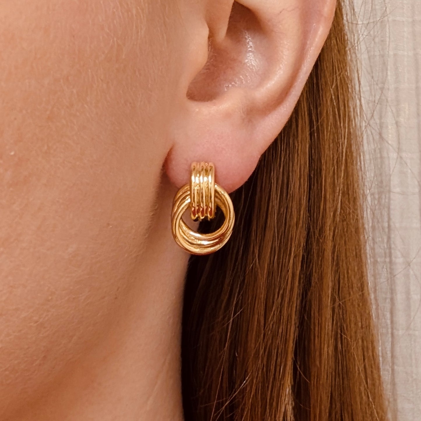 Close-up of an ear wearing gold hoop earrings with an opal gemstone.