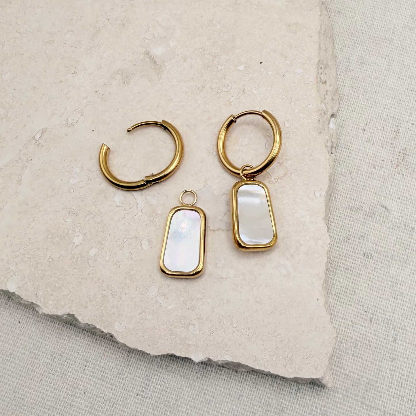 A pair of lightweight, everyday gold hoops with detachable Mother of Pearl charms so you can wear them multiple ways.