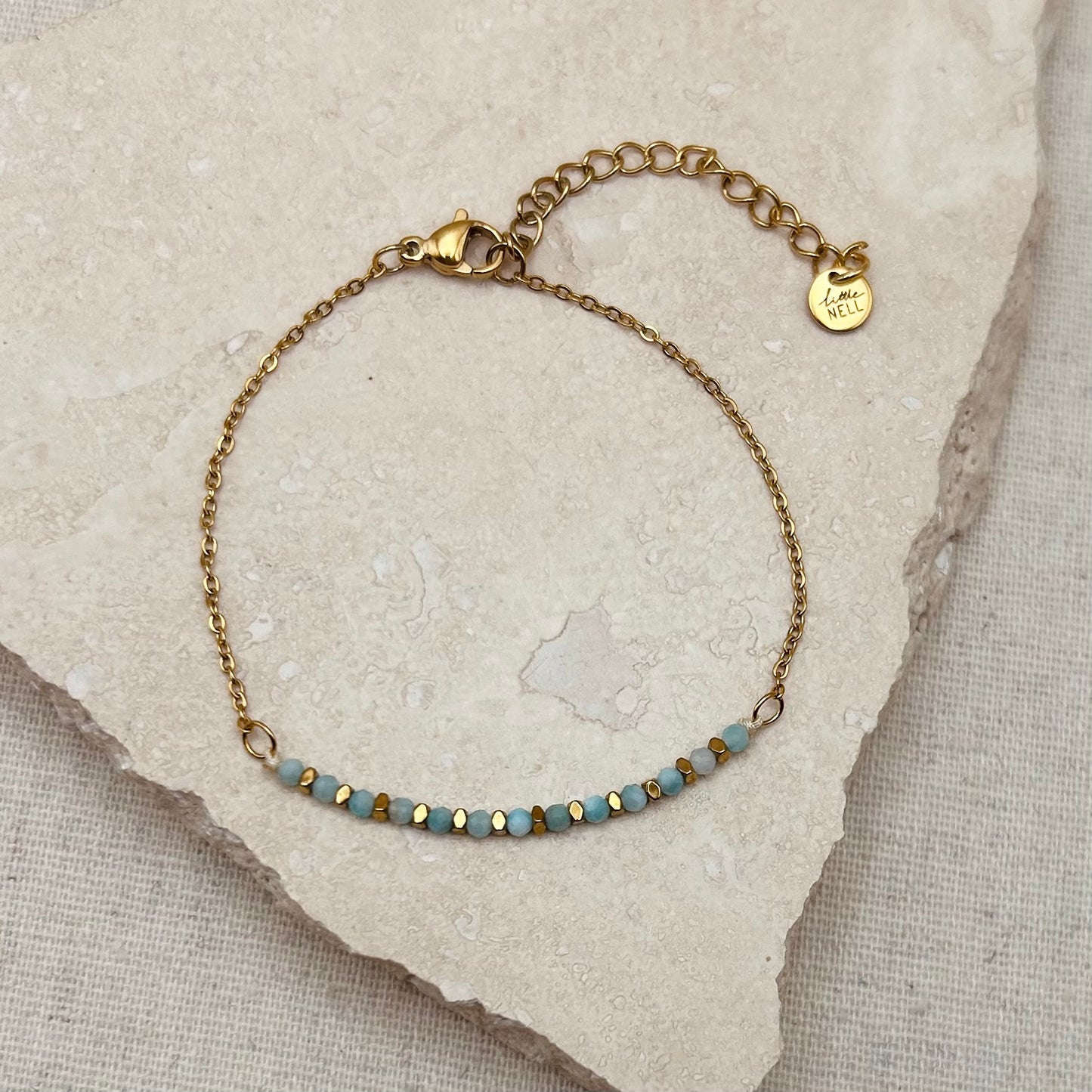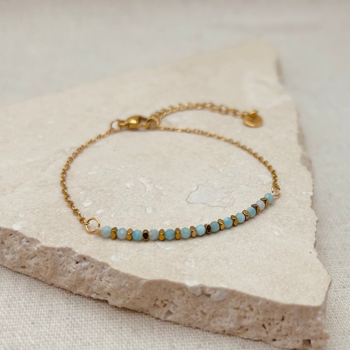 A delicate chain bracelet in 18K gold-plated stainless steel, fully waterproof and tarnish-resistant. Finished with faceted gold and Amazonite beads, thought to be the stone of courage and truth.