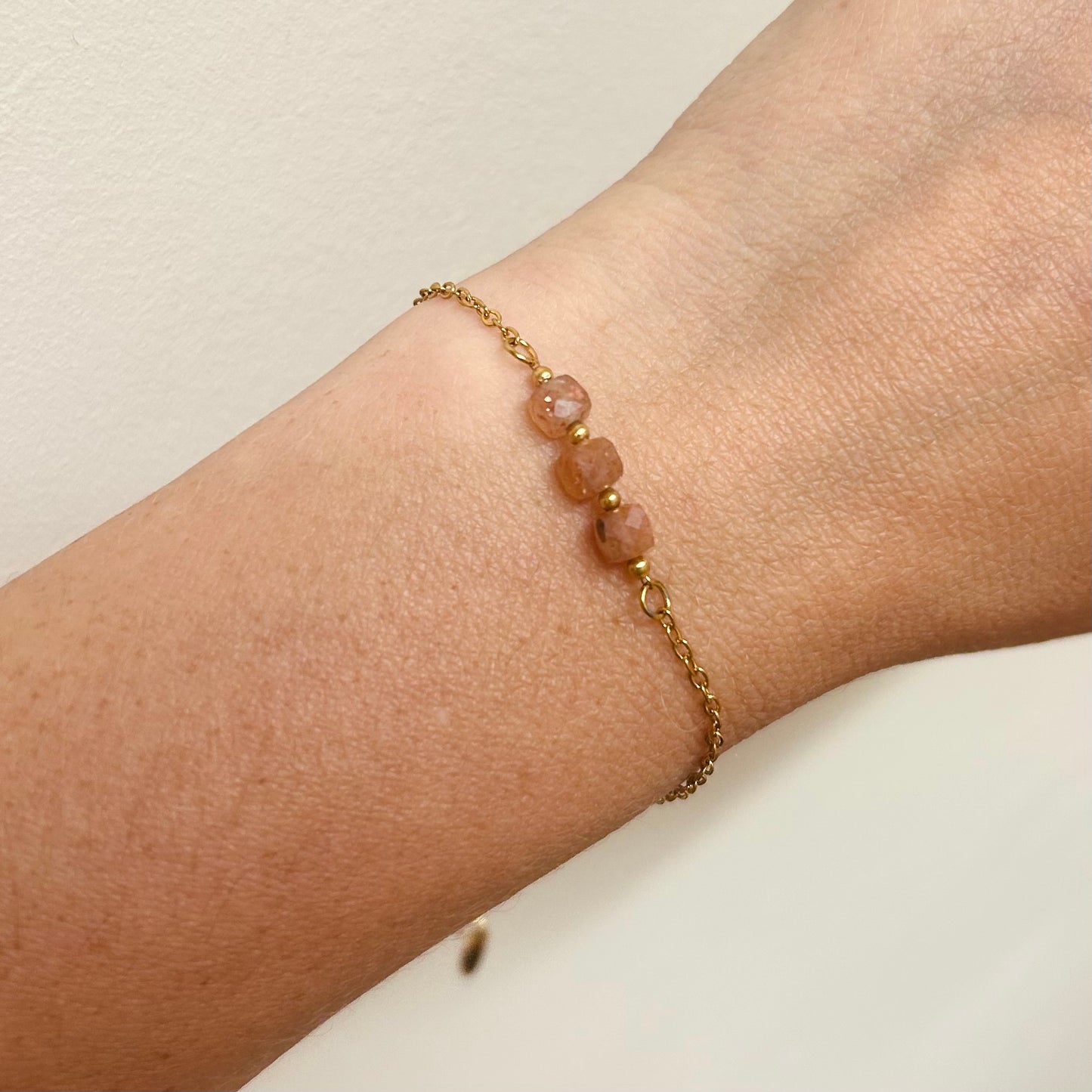 A delicate chain bracelet in 18K gold-plated stainless steel, fully waterproof and tarnish-resistant. Finished with Cherry Agate beads, thought to bring growth, joy and manifestation.
