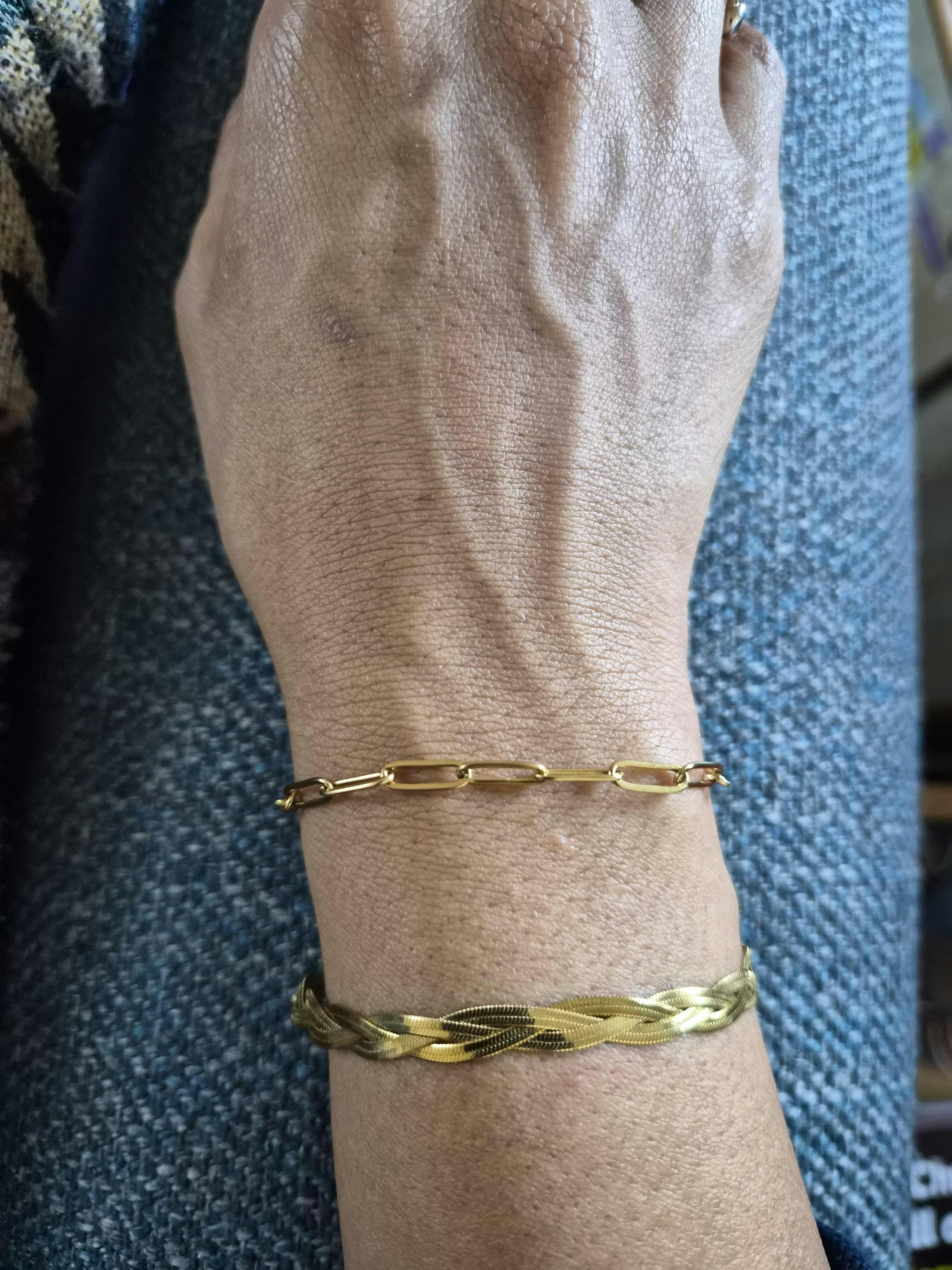 A plaited chain bracelet that sits flat to your wrist. Made of three entwined delicate snake chains.