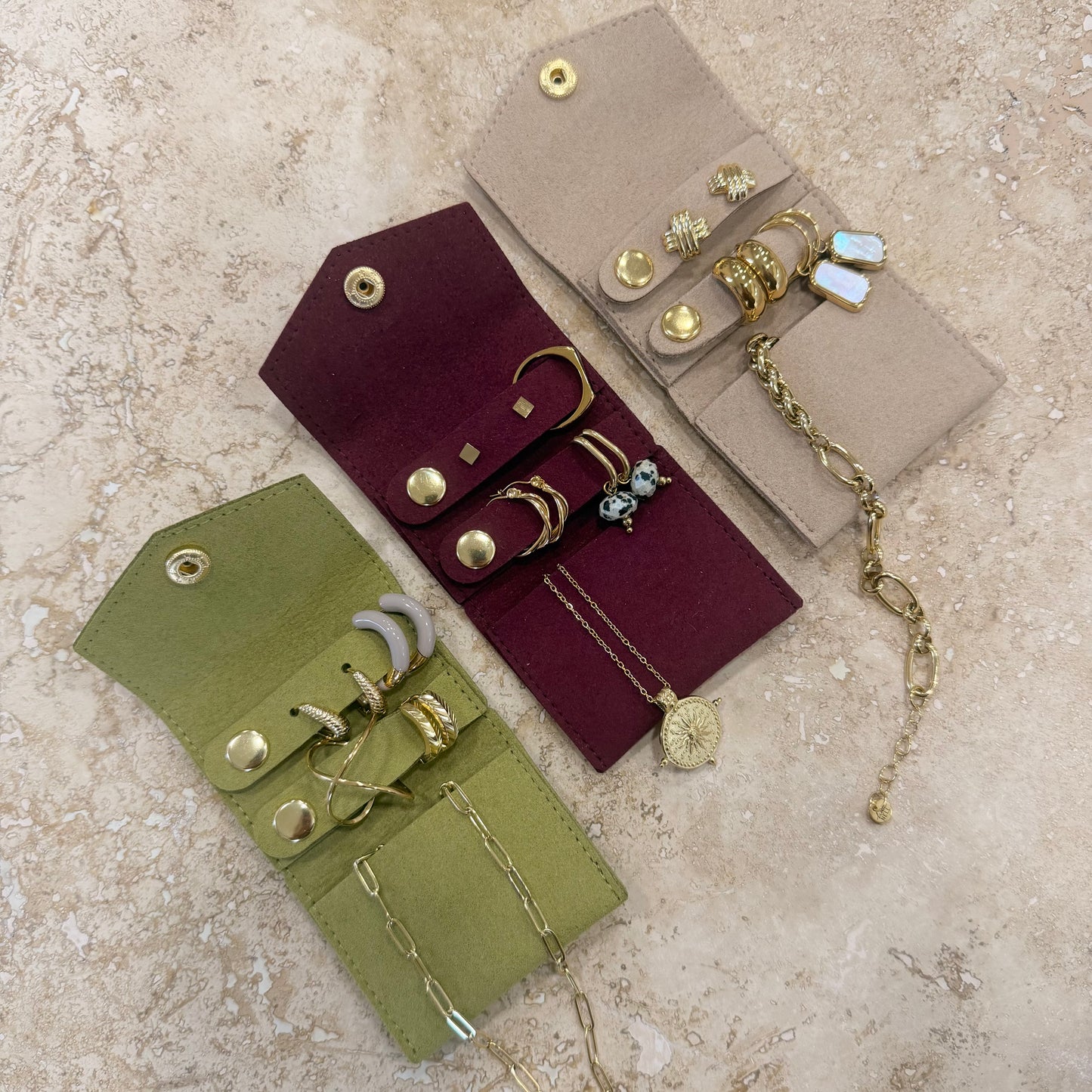 Crafted in vegan suede, with sections for earrings, rings, necklaces and bracelets.