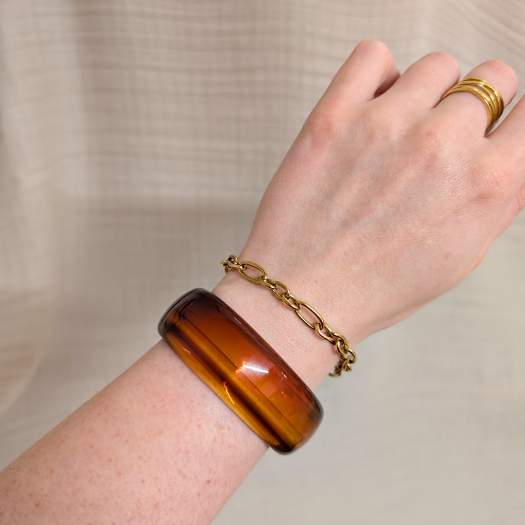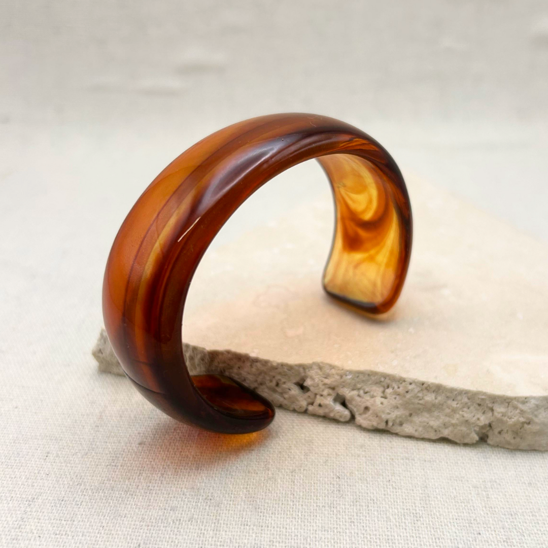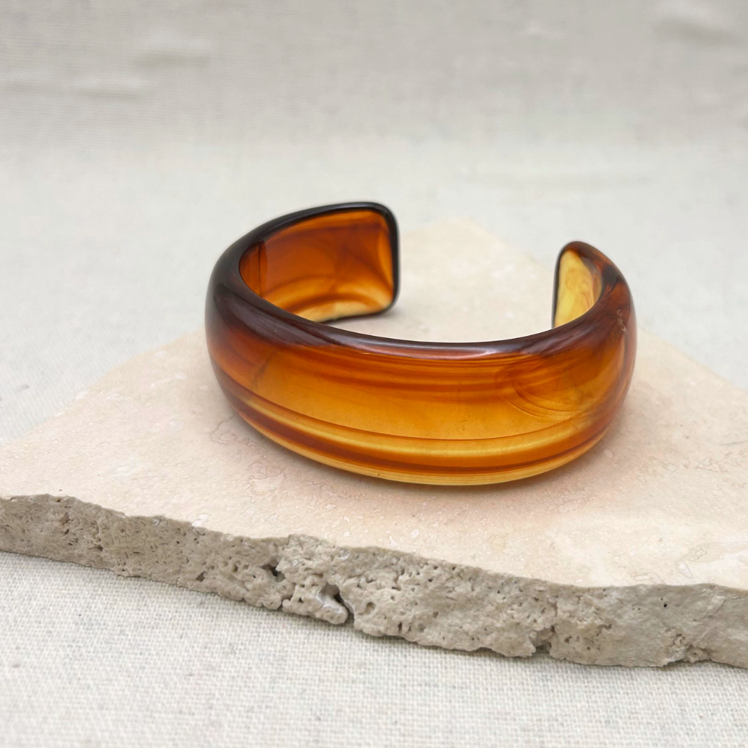 Meet our Amber Resin Cuff - a classic shape to add to your bangle collection. Stack it up with your favourite gold bracelets for a layered look or wear alone as a colourful statement.