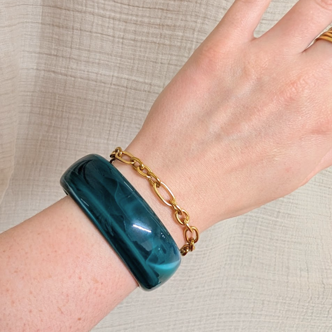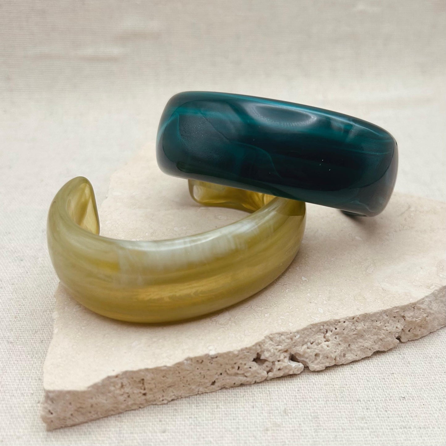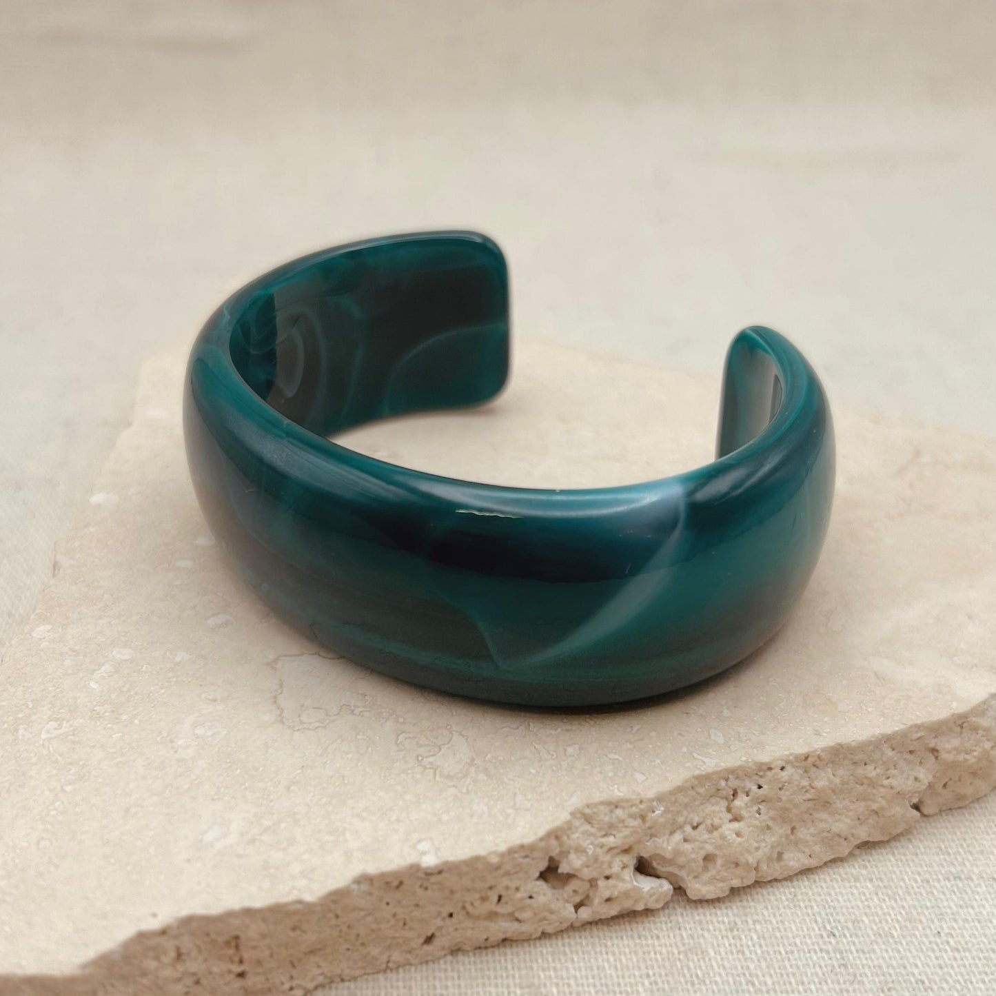 Meet our Bottle Green Resin Cuff - a classic shape to add to your bangle collection. Stack it up with your favourite gold bracelets for a layered look or wear alone as a colourful statement.