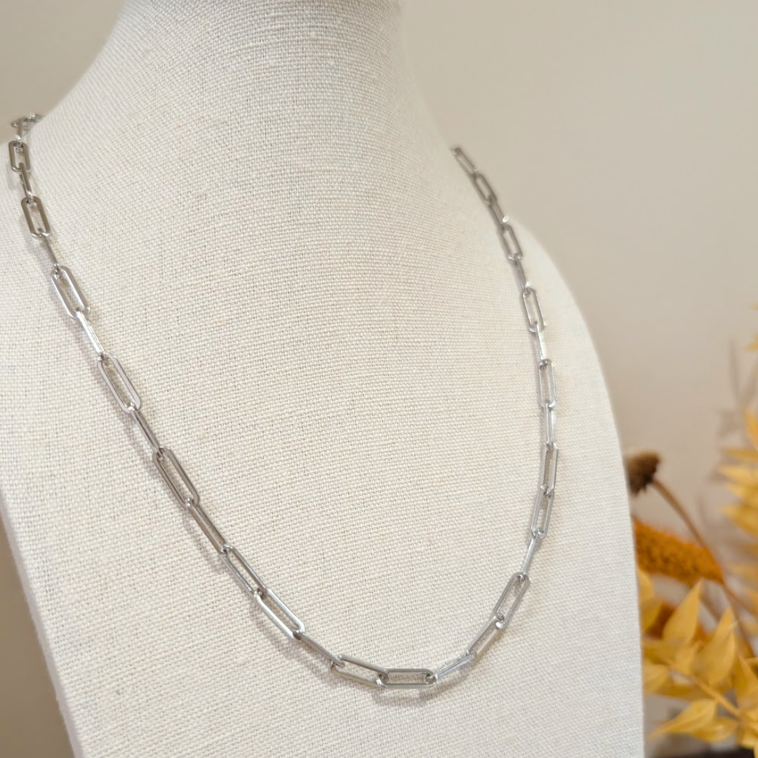 Silver plated necklace. Light and comfortable enough to wear all day, and works well as a stacking piece for a more eye-catching look.