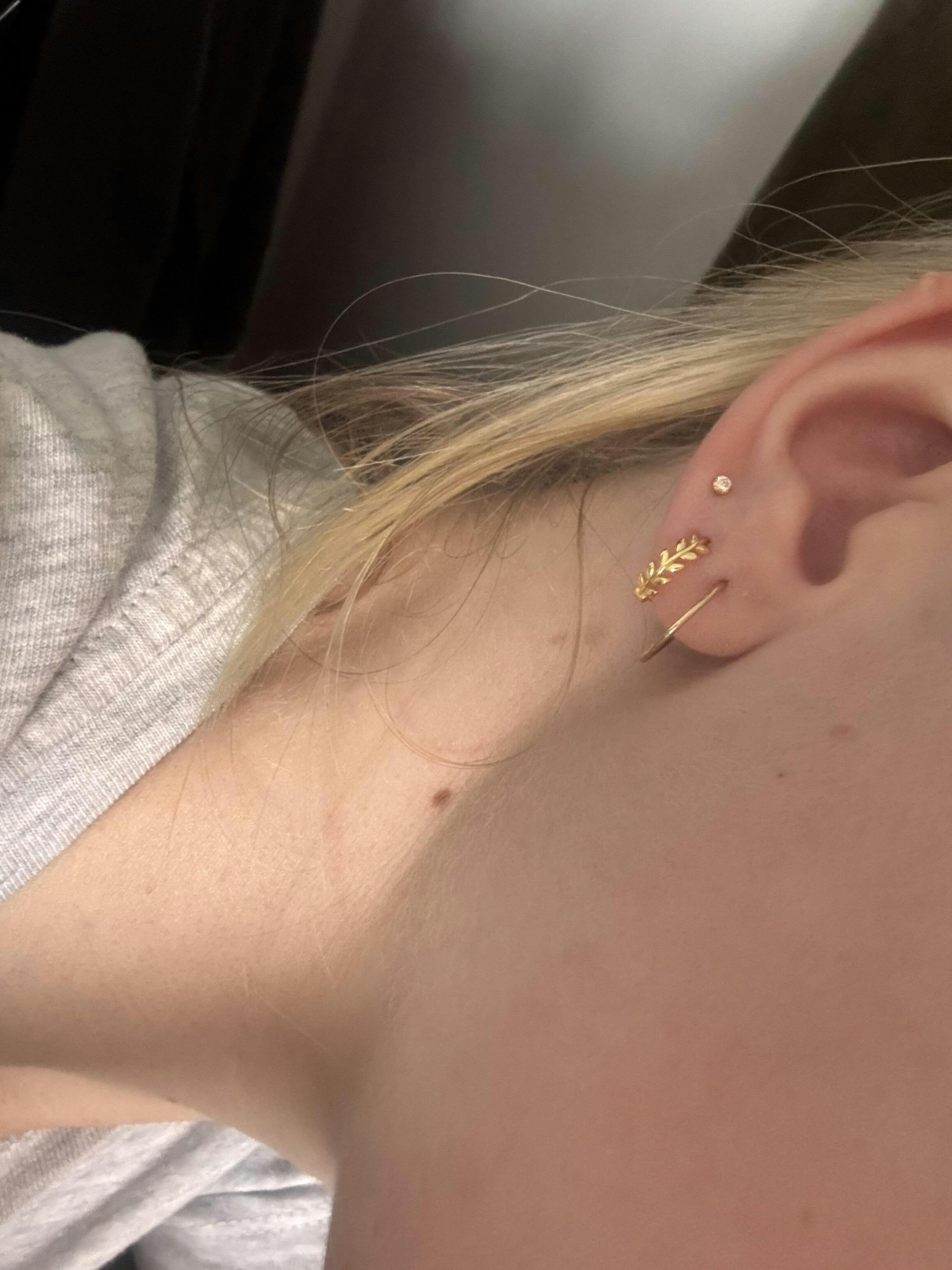 Hinged for comfort, gold plated over a sterling silver base making them suitable for sensitive ears. Look delicate and chic worn alone, but small enough to be stacked for a more dramatic look.