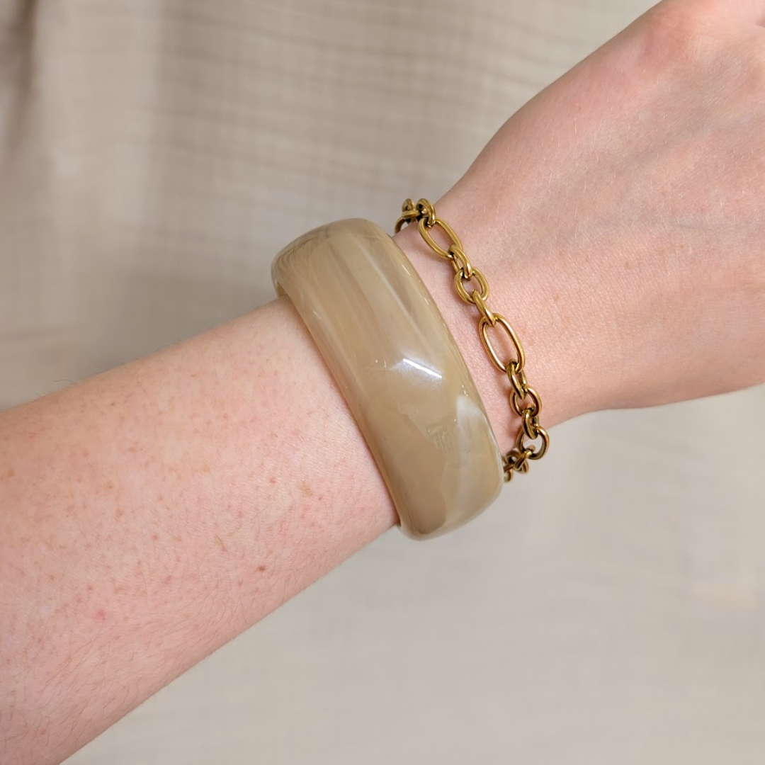 Meet our Mushroom Resin Cuff - a classic shape to add to your bangle collection. Stack it up with your favourite gold bracelets for a layered look or wear alone as a colourful statement.